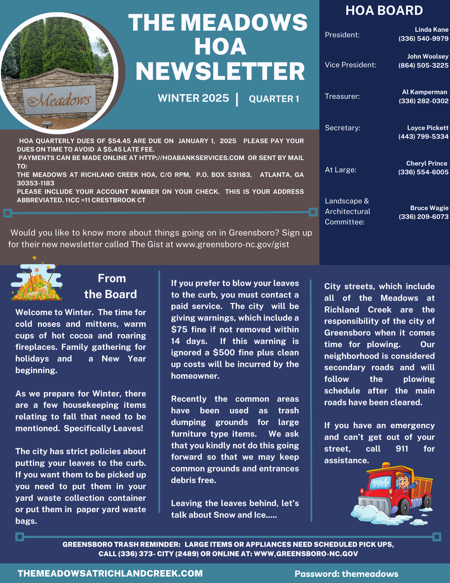 We’ve already had our first freeze and winter is on its way. With the first snow, your HOA Board member’s phones begin to ring with neighbors calling to ask, “When will our street be plowed?” The only answer we can offer is, “soon! and followed by, “we hope!”