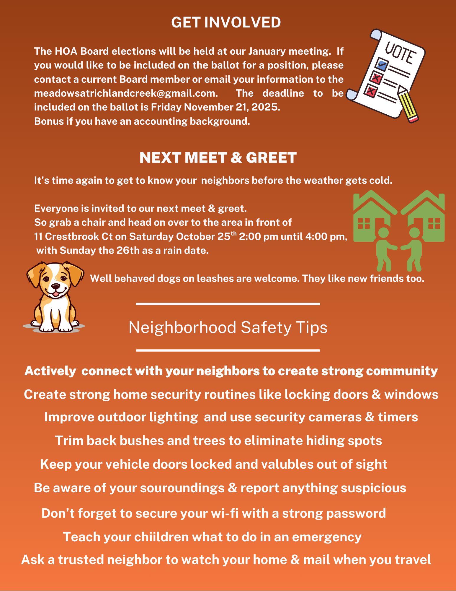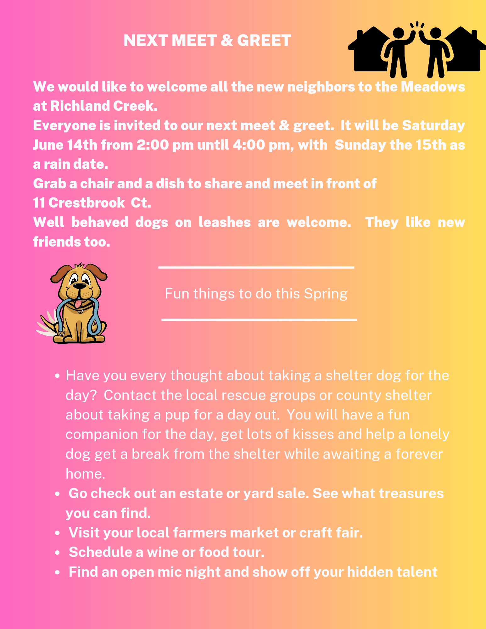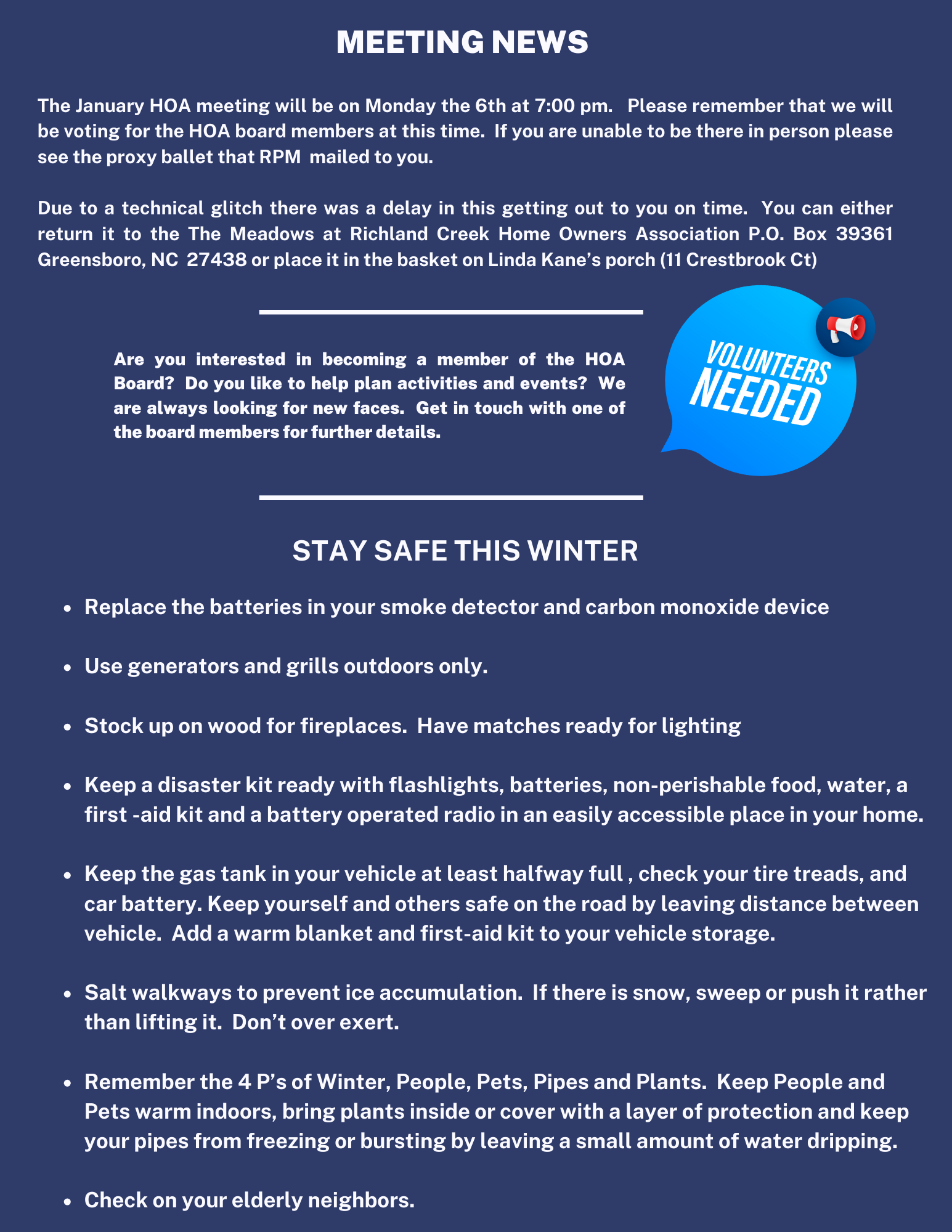 Please email us any news and events you want your neighbors to know about.
